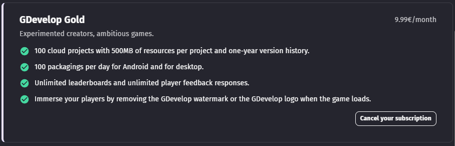 - The current GDevelop subscription running on your account.
