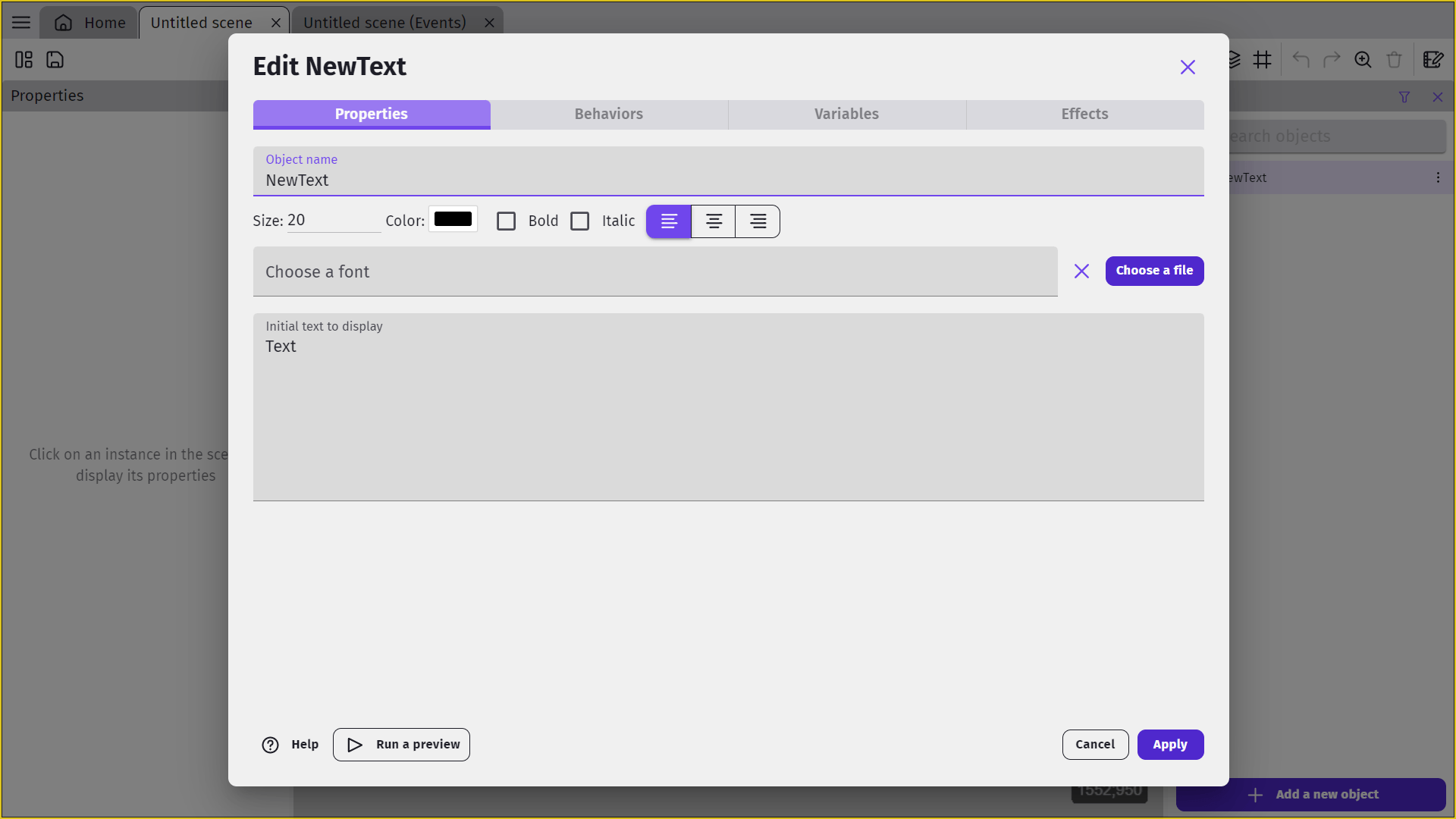 You can set the default text, displayed by the text object, using the central text field. Default text is what will be displayed when the text object is first displayed or created in a scene, but the text displayed by a text object can be modified during gameplay using events.