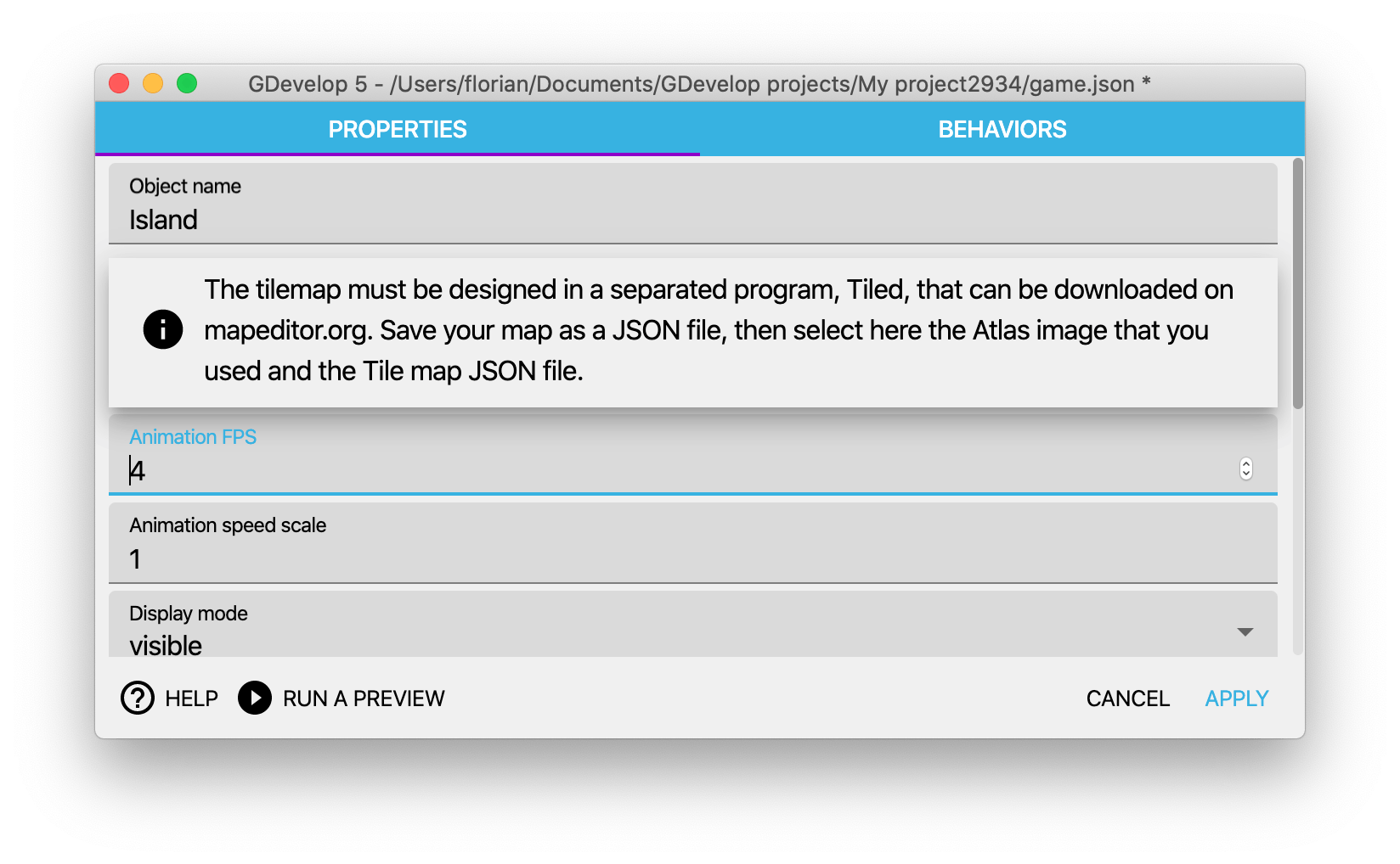 Finally, to display the map in GDevelop, choose to create a new Tilemap object. Then configure it by choosing your Atlas image (the image containing the tiles) and the Tilemap JSON file: