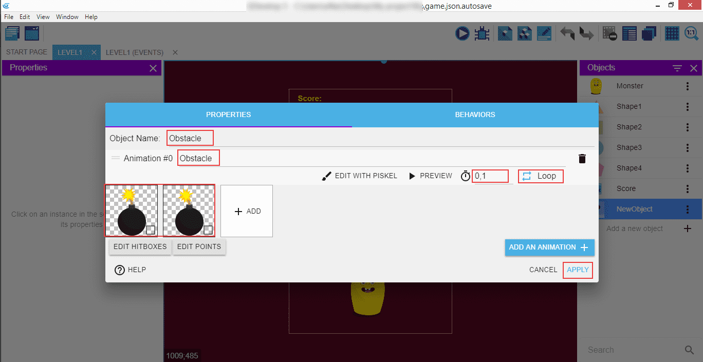 "Object's name" will be "Obstacle", same goes for the name of the animation. We have two frames of the animation to show, and it will last for 0,1 seconds, looped.