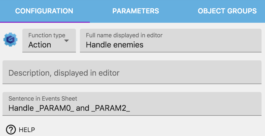 Navigate to the function "Parameters" tab and in the bottom choose "Add a parameter". Then, enter "Enemy" for the parameter name, then "Objects" for the type. You can enter "Enemy" as the label too (this is what will be displayed when you add the action in the scene events sheet).